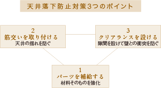 地震時における天井脱落による被害を防止すべく、「特定天井」に該当する建物には、脱落防止対策を行うことが義務づけられました。